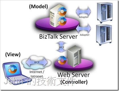 幸好,.NET Framework 3.5中提供了WF的基礎架構,讓我們可以將這些邏輯從頁面中抽離出來定義成流程,然後再透過WCF基礎架構,結合IIS 7.0的WAS(Windows Activation Service),我們很容易就可以將工作流程以各種不同的繫結方式,以IIS作為流程控管中心發佈到網際網路或是區域網路中。而用戶端(View)也不再侷限於瀏覽器的架構,因此你可以更容易的使用Windows表單或是WPF表單開發具有高度互動性,並且支援離線操作的使用者操作介面(ex:MSDN Reader、Windows Live Writer......)。至於Model的部分,通常會需要與較多的後端資源結合,並提供給多種前端程式共用,因此可以使用BizTalk Server 2006 R2建立企業級的流程,與IIS中的工作流程(Controller)結合,如此一來,就可以建立具有兼具有彈性、可維護性的新一代企業級分散式架構!!